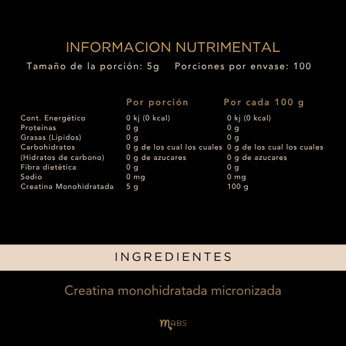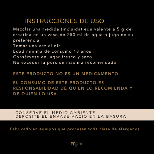 - Creatina Monohidratada pura al 100%, formulada sin saborizantes, colorantes ni aditivos.